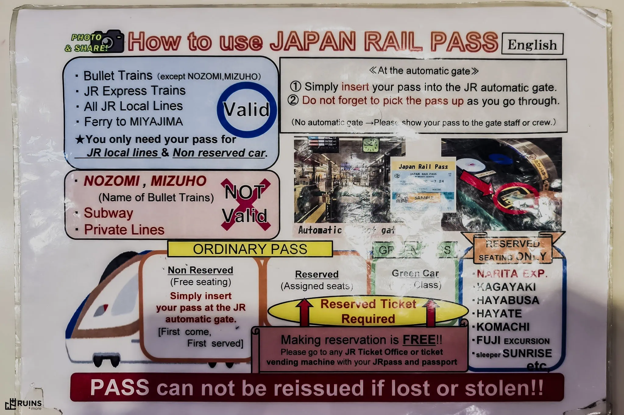 6) Сразу по прибытию в Японию рекомендую добраться до железнодорожного вокзала, где в специальном офисе (JAPAN RAIL PASS exchange office) поменять ваучер JR Pass на билет, которым вы в дальнейшем будете пользоваться для прохода через турникеты к перронам. Во время обмена покажите билетёрше план ваших маршрутов и попросите, чтобы вам зарезервировали сидячие места в соответствующих сикансенах 🚅. Потому что на популярных направлениях день в день свободных мест может не оказаться или останутся только одиночные места, разбросанные по разным вагонам. Если ваш план потом нарушится – ничего страшного, вы сможете ещё раз забронировать места на новое время. Для примера – нам с трудом нашли места на поезд JR из Токио до Оцуки и обратно дней за 10 до нашей поездки! А это, между прочим, была поездка к горе Фудзи. Если всё пройдёт удачно, то в дополнение к билету JR Pass вам выдадут набор квитков с указанием поездов, вагонов, мест. Ниже памятка как пользоваться JR Pass, которую демонстрируют в офисах по обмену ваучеров.