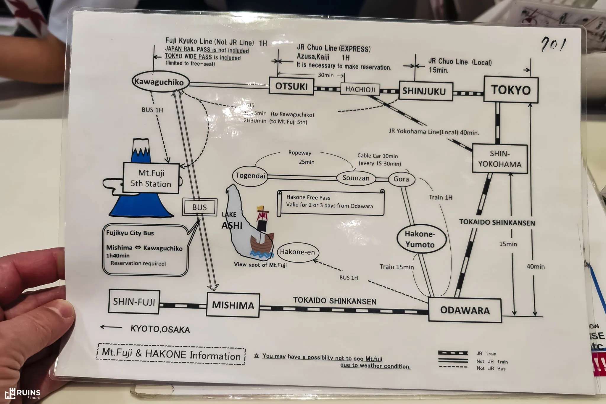 9) Теперь как добраться из Токио до Кавагутико. В интернете пишут, что самый удобный способ – на автобусе. Автобусы Fujikyu и Keio курсируют между автовокзалом Синдзюку в Токио и станцией Кавагутико с частотой отправления два раза в час. Поездка занимает примерно два часа. Но мы путешествовали поездом. Из Токио на поезде JR мы доехали до станции Оцуки, где купили билеты на местную линию до Кавагутико (без гарантии посадочных мест). Дорога заняла чуть больше двух часов с учётом пересадки. Все варианты поездки к Фудзи из Токио представлены на схеме ниже.