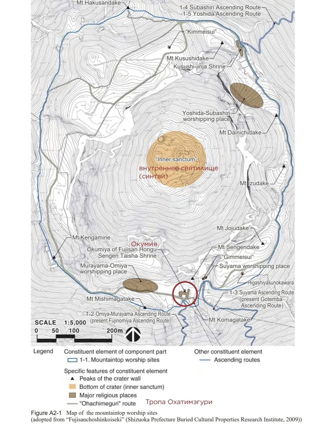 Главным святилищем культа Фудзи считается расположенное у южного подножия горы дзиндзя Фудзисан Хонгу Сэнгэн Тайся, которому с 1779 года принадлежит вершина вулкана начиная с высоты 3270 метров над уровнем моря, то есть от восьмой станции. За исключением туристических троп. Внизу, в хондэне этого святилища хранятся синтаи всех трёх упомянутых выше ками. Должно быть это интересное место, поскольку дошедшие до нашего времени хондэн и главные ворота (ромон) построены ещё сёгуном Токугава Иэясу (прототип Ёси Торанага из романа и сериала “Сёгун”) в начале XVII века. А наверху, на самой вершине вулкана, есть небольшой комплекс из ворот-торий и хайдэна, который называется Окумия. Хондэна тут, как вы понимаете, нет, так как сама вершина горы является телом Асама-но и хондэном ей служит вся Япония. Или как минимум остров Хонсю.