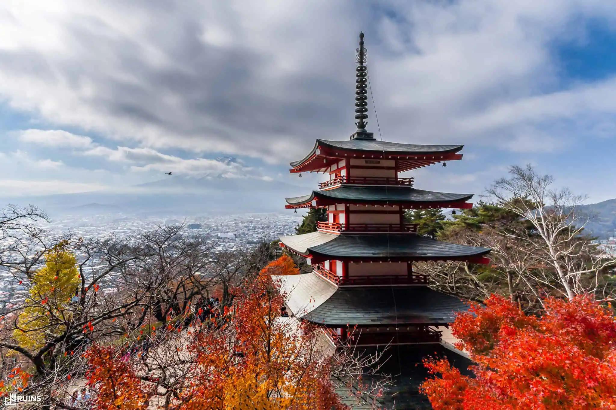 Возможно, вид сверху на пагоду Чурейто в ноябре не столь ярок, как в апреле, но тоже весьма колоритен поскольку красный цвет пагоды поддерживает немногочисленные клёны, окружающие её. Однако деревьев сакуры там значительно больше, их насчитывается более 600 штук, поэтому каждый год в первой половине апреля здесь проводится фестиваль цветения сакуры 🌸.