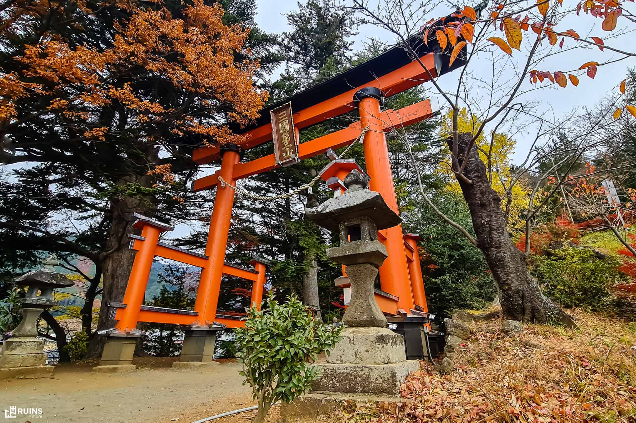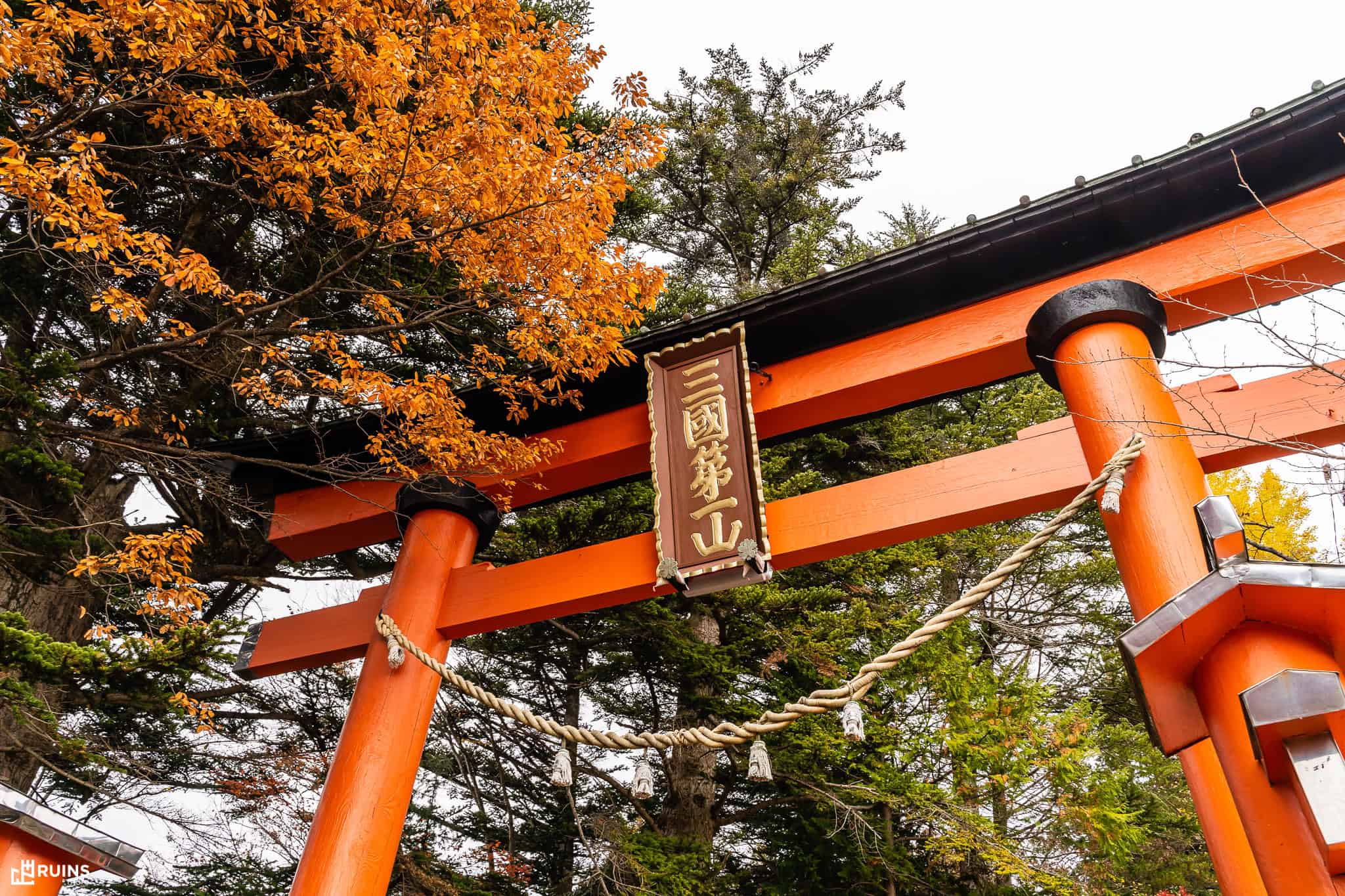 В начале лестницы, предваряя вход на священную гору, возвышаются колоритные ворота-тории цвета киновари. Они, также как и знаменитые плавающие тории Ицукусимы, выполнены в стиле рёбу, то есть с дополнительными столбами по бокам. Их украшают верёвки симэнава, а на табличке между перекладинами без ложной скромности написано «Гора №1 в Трёх Королевствах». Под горой, как вы догадались, имеется в виду гора Фудзи, а под тремя королевствами – Япония, Китай и Индия. Эта надпись отсылает нас в 807 год н. э., когда император Хэйдзё подарил святилищу мемориальную доску с этим собственноручно начертанным титулом. Титул признавал Фудзисан самой великой горой из известных императору на тот момент и был дарован святилищу в благодарность за эффективные мольбы о прекращении недавнего извержения.