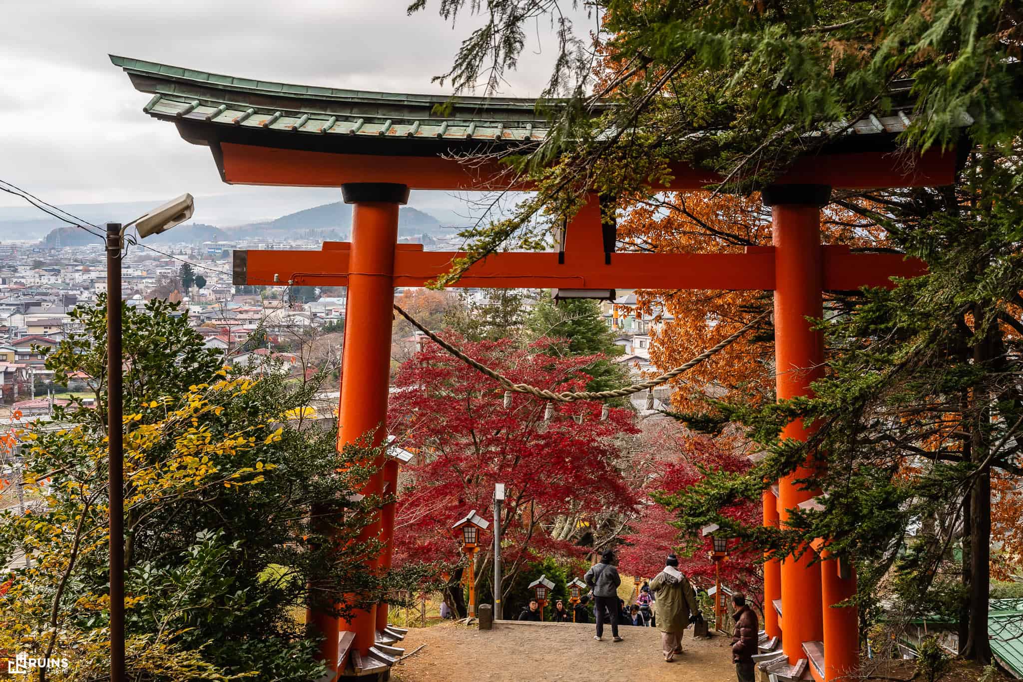 Когда мы добрались до специально оборудованной площадки, на которой в режиме шпрот умещается примерно сотня человек, Фудзи не было. Обычное дело для места, где обитает женское божество. Вероятно, Коноханасакуя-химэ наводила утренний марафет и укрылась непроглядным туманом от посторонних взглядов. Однако вид с террасы открывался замечательный. Перед нами покоилась долина с городком, прижатым к земле низким хмурым небом, как будто импортированным из Беларуси в честь нашего приезда. В некоторых местах плотную ткань малоэтажной городской застройки прорезали невысокие горные хребты, напоминающие гребни на спине лениво всплывающих из недр земли японских драконов 🐉. Эту печальную пастораль яркими красками разгоняли находящиеся на переднем плане красная пагода Чурейто и окружающие её разноцветные клёны. Всего несколько десятков путешественников с безнадёжностью взирали в направлении Фудзисан, пытаясь уловить сквозь туман её не проступающие очертания. Я подумал, что мы дальновидно поступили, приехав сюда в понедельник, а не в воскресенье, спокойно сделал пару снимков и пошёл бродить по окрестностям. Видимо, свою роль сыграл и неустойчивый прогноз погоды, который отпугнул туристов, не желавших наблюдать за облаками вместо памятника ЮНЕСКО.