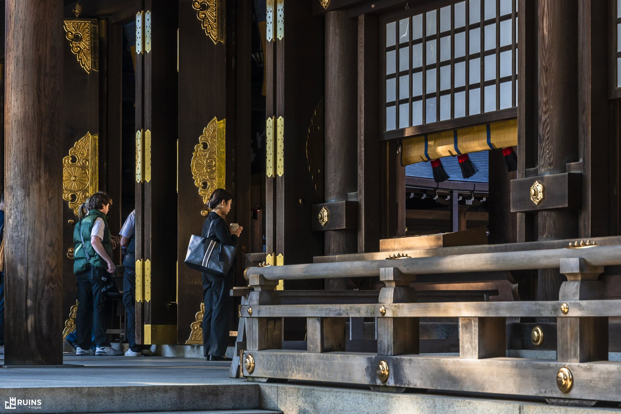 Я склонен к первому варианту, поскольку этот монумент выглядит как памятник общественно-политическому деятелю, а не как божеству. А вот Мэйдзи как божеству, а также его жене Сёкэн, посвящено огромное синтоистское святилище в Токио в районе Сибуя. Это святилище имеет обширный великолепный парк и гигантский храмовый комплекс, всегда заполненный местными жителями и приезжими, которые приходят с просьбами к ками Мэйдзи или заказывают ритуалы, связанные с рождением ребёнка, свадьбой и другими важными семейными событиями. И там есть всё, что должно быть в классическом синтоистском святилище. А вот памятника Мэйдзи там нет. Потому что незачем очеловечивать божество, которому поклоняется такое количество людей.