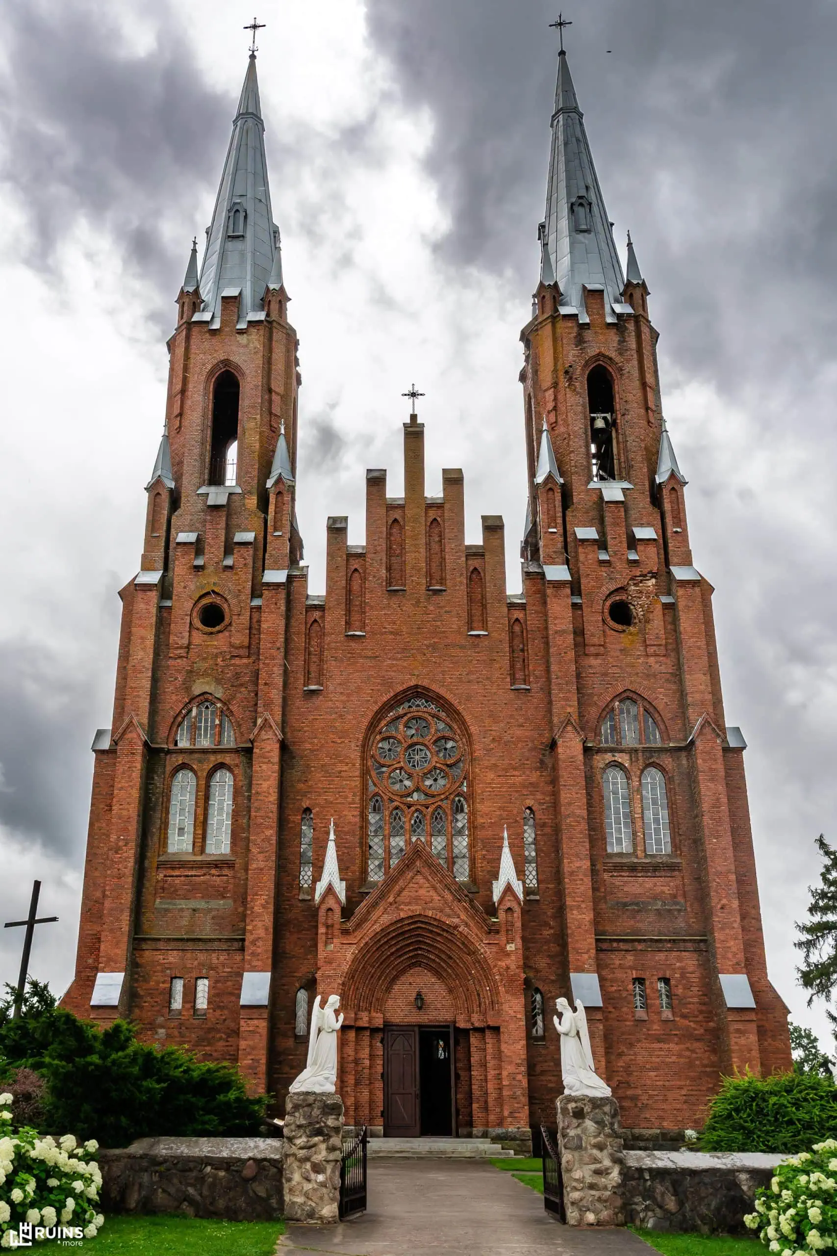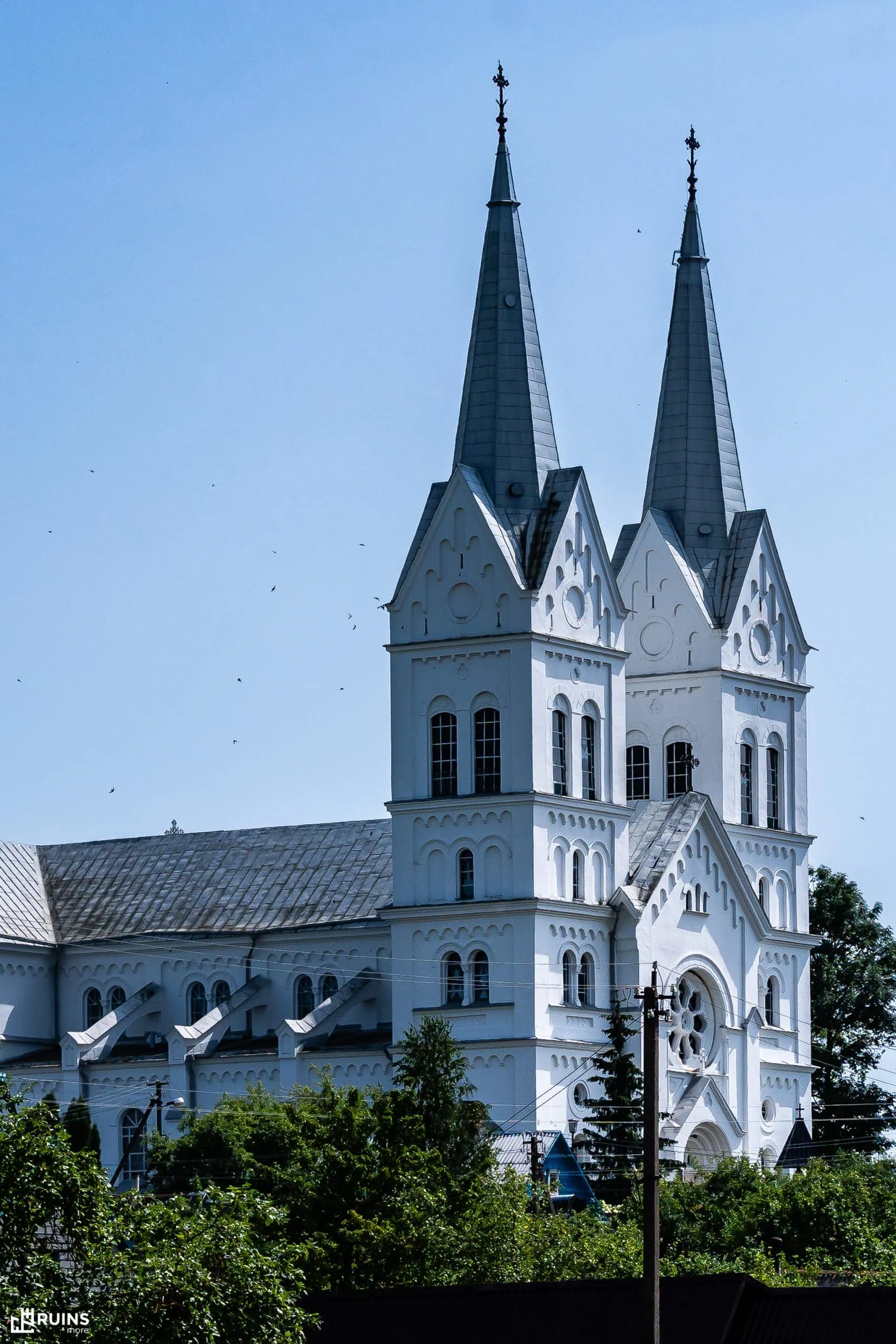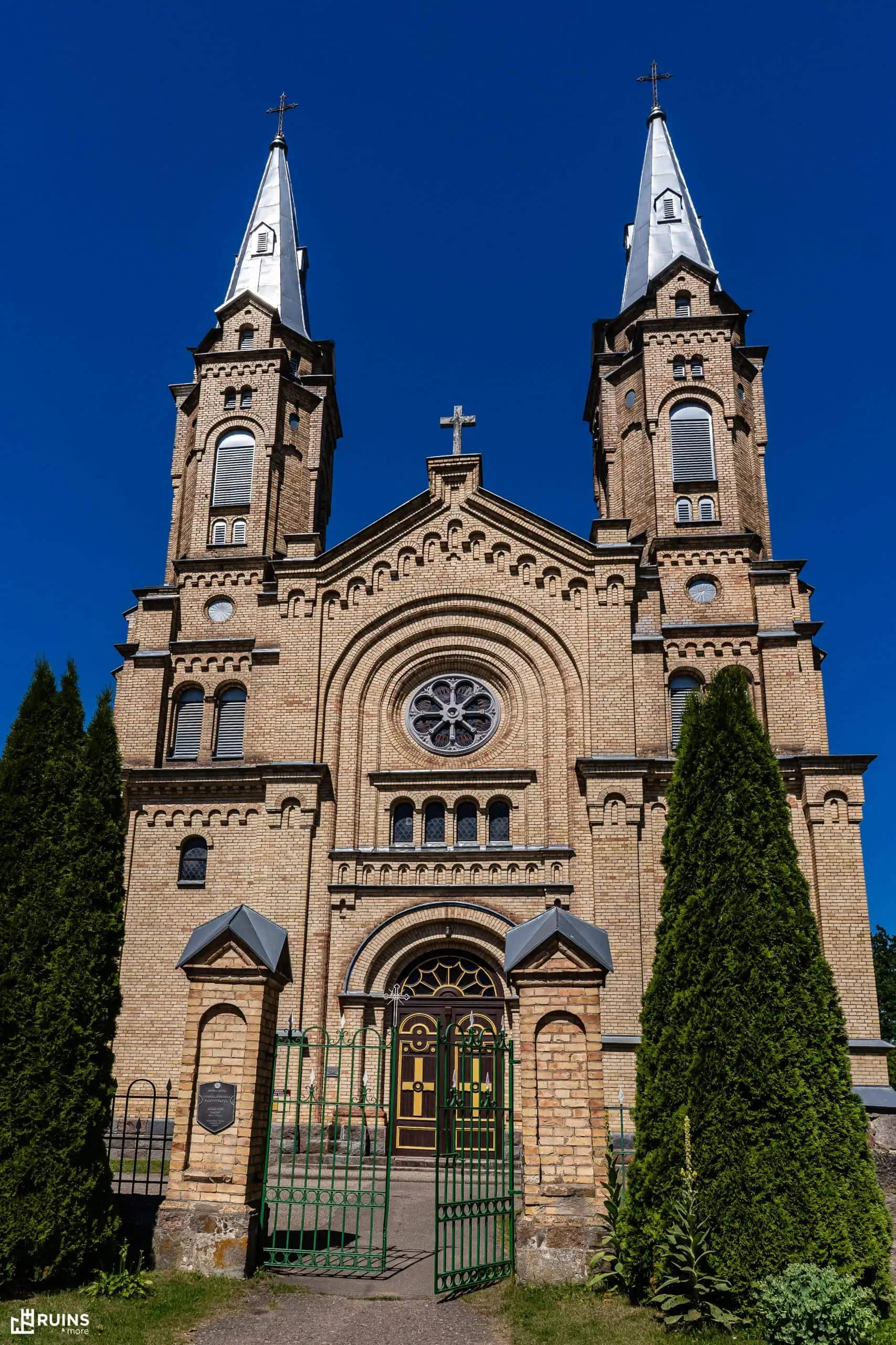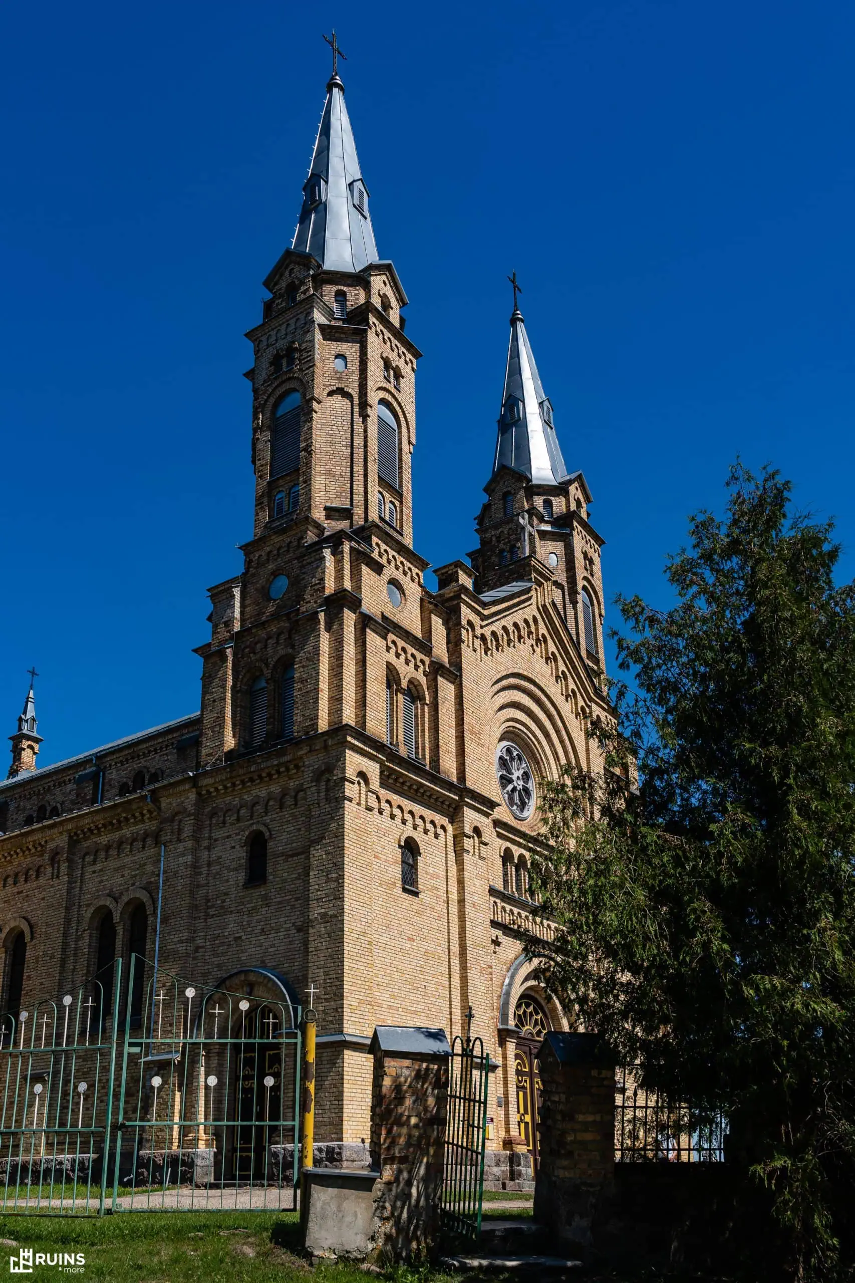 Свернув налево с трассы М6 Минск – Гродно уже через несколько километров вы увидите, как из-за моренного холма выступают башни храма с высокими шпилями, тянущие за собой то ли длиннющий «неф собора», то ли зубчатый хвост дракона, состоящий из крон деревьев кладбищенского перелеска. Из-за этих шпилей при подъезде к костёлу ожидаешь увидеть неоготический храм и, упёршись взглядом в окно-розу над входным порталом, так и воспринимаешь его по первому ашчушчэнию ощущению. Но чуть позже осознаешь, что окно-роза – вовсе и не роза, а шпили – почти единственные артефакты готического стиля в этом преимущественно неороманском здании.