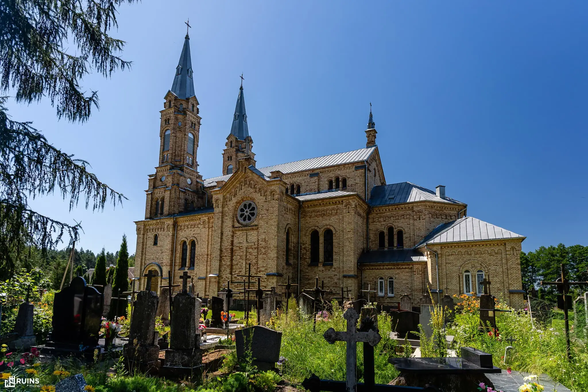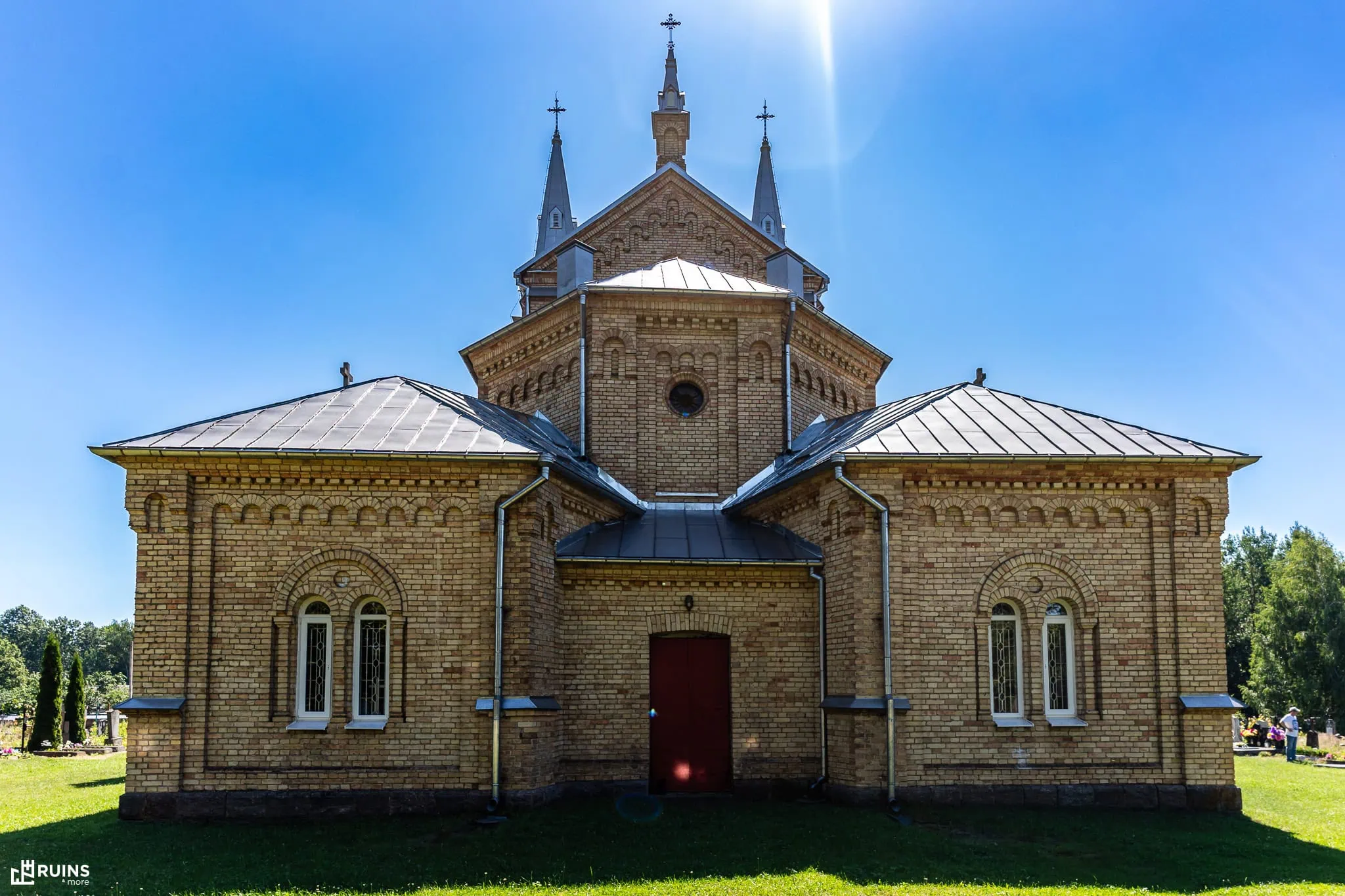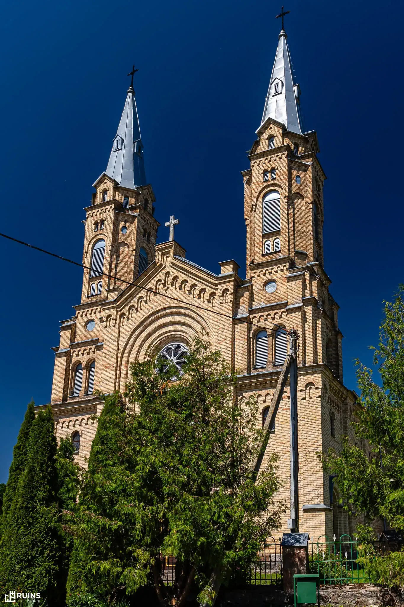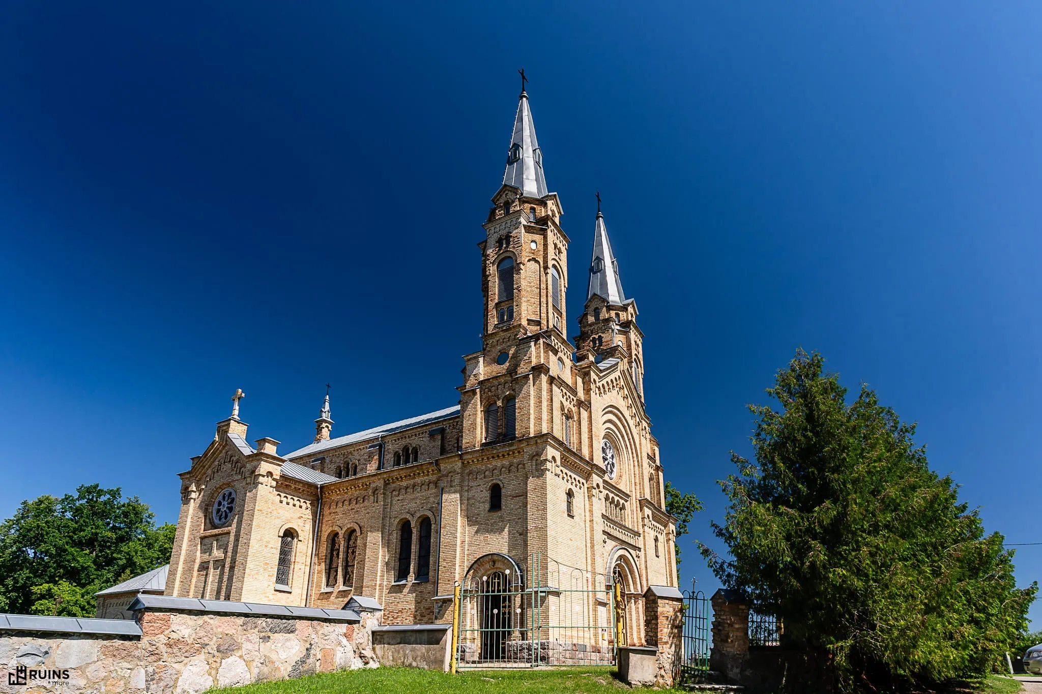 Свернув налево с трассы М6 Минск – Гродно уже через несколько километров вы увидите, как из-за моренного холма выступают башни храма с высокими шпилями, тянущие за собой то ли длиннющий «неф собора», то ли зубчатый хвост дракона, состоящий из крон деревьев кладбищенского перелеска. Из-за этих шпилей при подъезде к костёлу ожидаешь увидеть неоготический храм и, упёршись взглядом в окно-розу над входным порталом, так и воспринимаешь его по первому ашчушчэнию ощущению. Но чуть позже осознаешь, что окно-роза – вовсе и не роза, а шпили – почти единственные артефакты готического стиля в этом преимущественно неороманском здании.