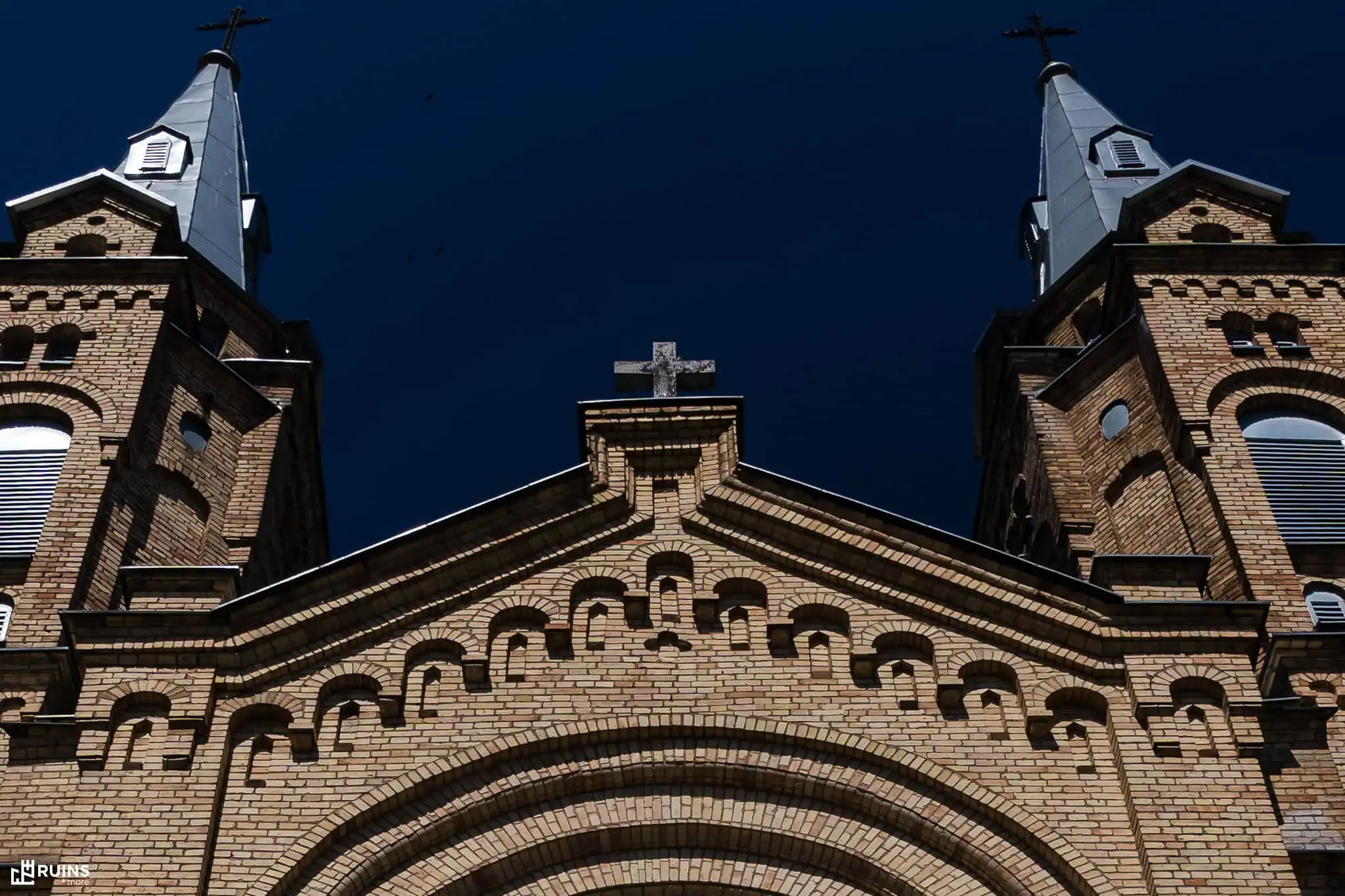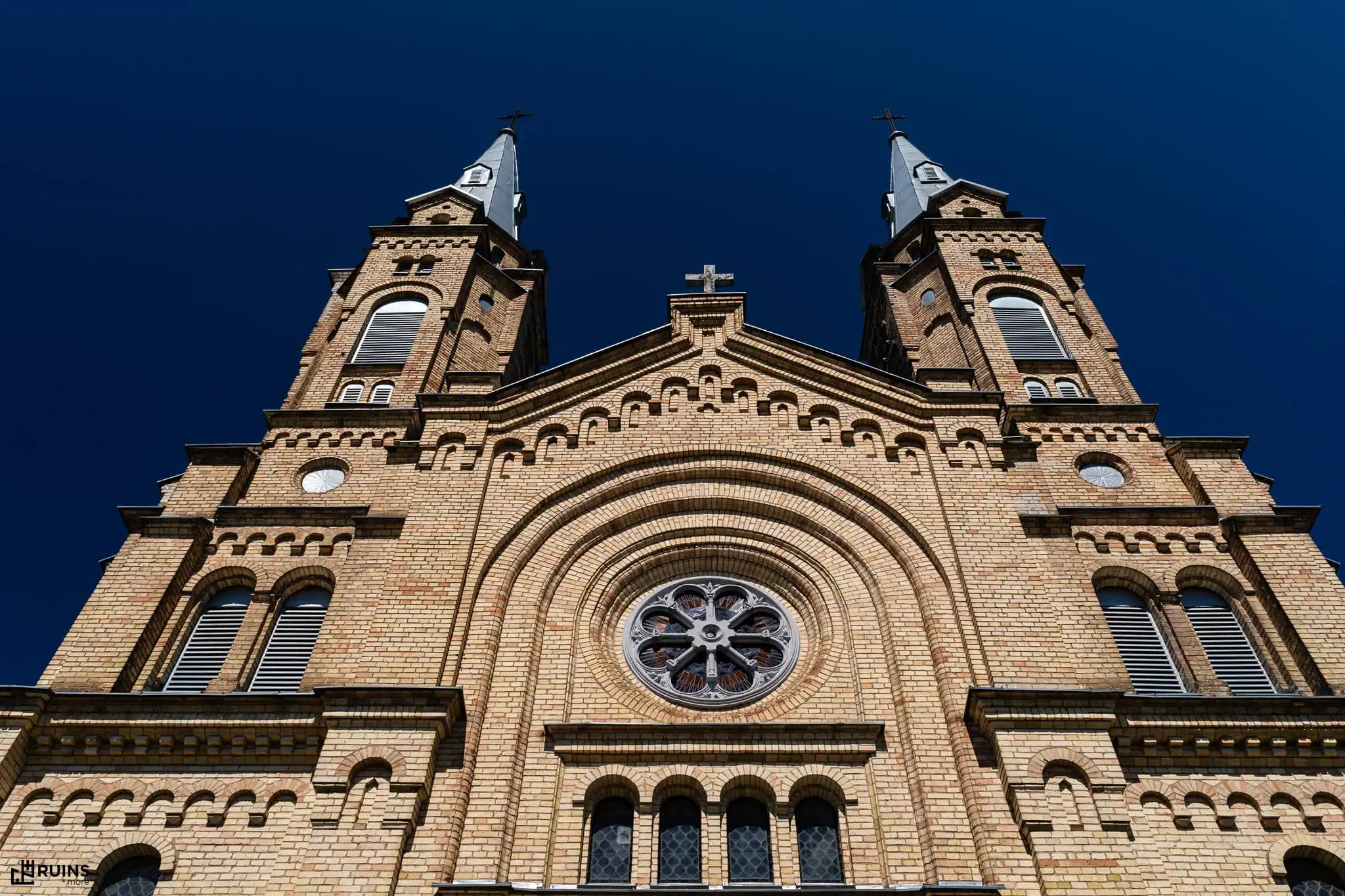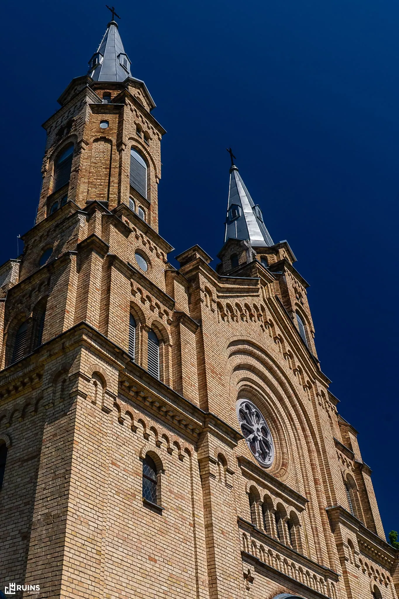 Давайте выйдем наружу и осмотрим экстерьер храма. Внимание сразу привлекают башни — высотные доминанты костёла св. Михаила Архангела. Они буквально «с ног до головы» покрыты романскими арками и аркатурными фризами, но при этом производят впечатление готических. Эффект достигается за счёт телескопической формы: каждый последующий ярус немного уже нижнего.