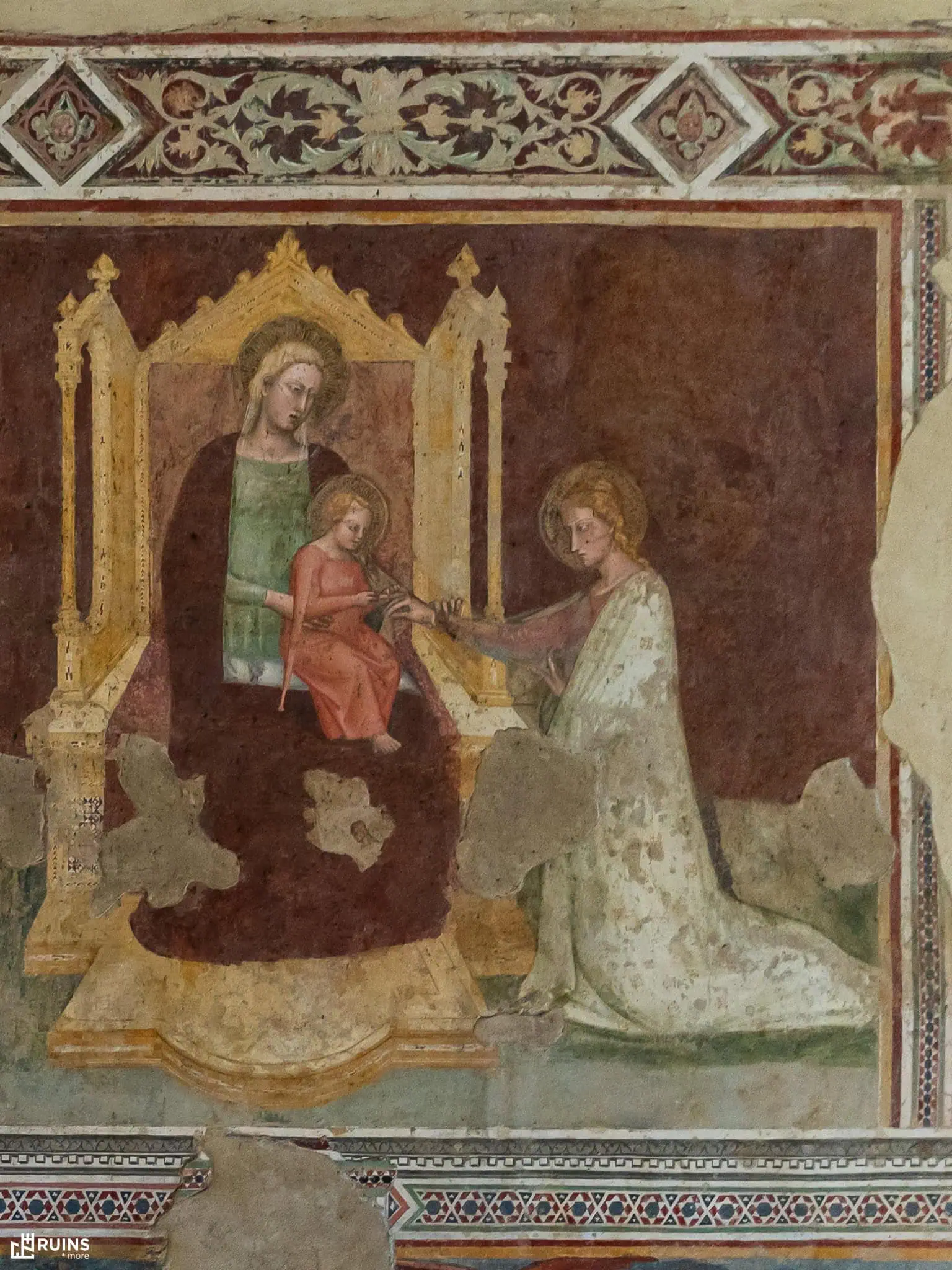 В христианской же эсхатологии окно-колесо переосмысливается и становится символом святой Екатерины Александрийской — мистической невесты Христа, и потому иногда называется «екатерининским». Культ этой святой был чрезвычайно популярен в Средневековье, поэтому её образ нередко встречается на фресках храмов и на картинах известных художников. Узнать святую Екатерину нетрудно: она почти всегда изображается рядом с орудием своего мученичества — колесом с шипами, аллегорией которого и служит романское окно-колесо🛞.