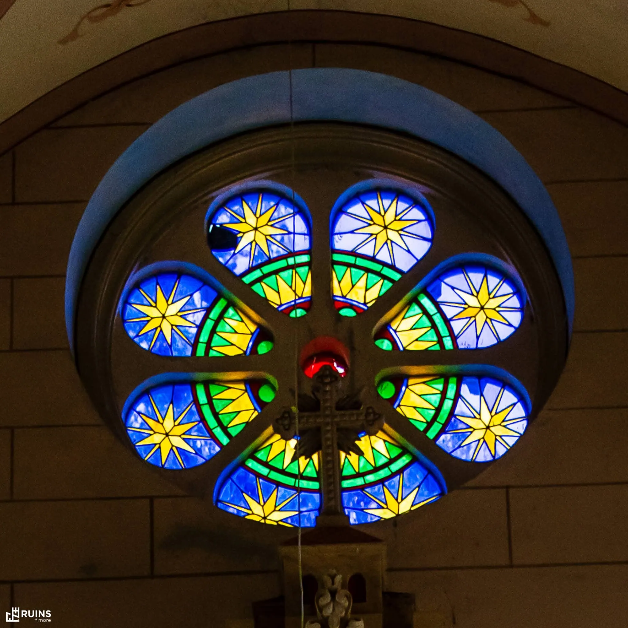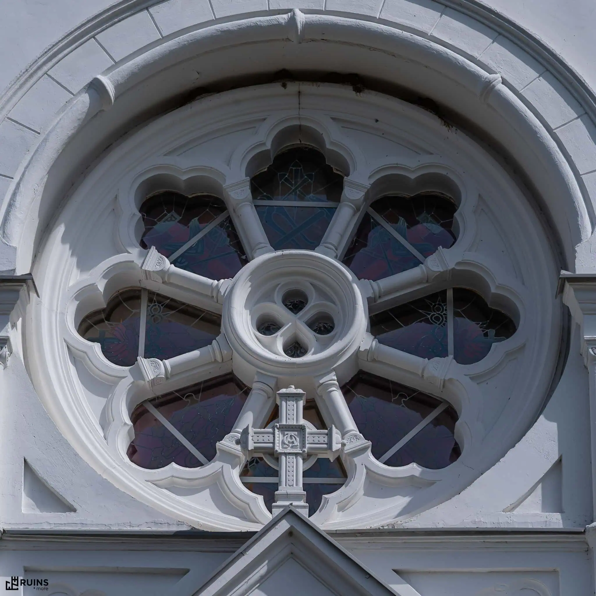 Поговорим о больших круглых окнах храма св. Михаила Архангела в Белогруде. Это не готические окна-розы, их переплёт не похож на растительный или пламенеющий орнамент, скорее они подобны колёсам со спицами. Так и есть – вы видите перед собой романские окна-колёса, чьё внутреннее пространство разделено на восемь сегментов импостами – маленькими колоннами с коринфскими капителями, соединёнными всё теми же полуциркульными арками. Все три окна-колеса в костёле св. Михаила Архангела – одинаковые; их переплёты выполнены фабричным способом и шедеврами назвать их сложно. Зато какой пласт символов они несут!