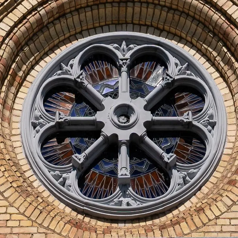 В романских храмах Италии количество спиц в окне-колесе обычно составляет 12 — число апостолов или месяцев в году; нередки и более сложные варианты с 16 или 24 секторами. А вот вариант с восемью спицами чаще встречается в странах севера Европы и в Англии; он также характерен для неороманской архитектуры Беларуси. Например, в центральном окне моего любимого костёла в деревне Слободка Браславского района их тоже восемь.