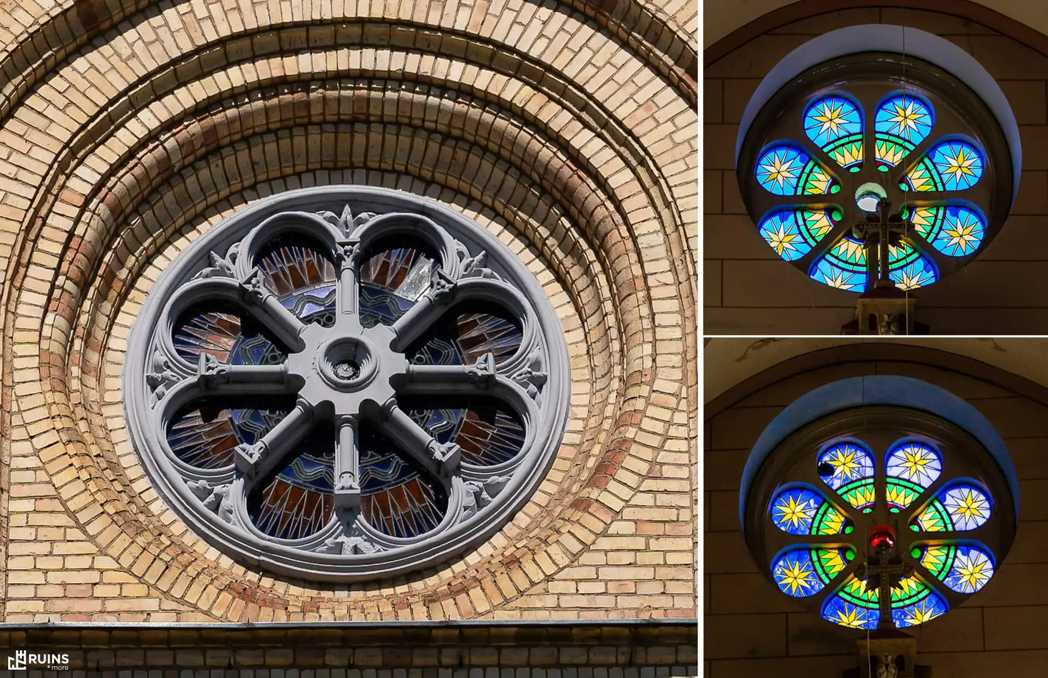 В романской архитектуре XII–XIII веков окна-колёса, особенно в тёплой Италии, обычно оставались без стекла. Иногда могли применять простое стекло, слюду, резные каменные решётки — многое зависело от климата. Цветные витражи в таких окнах ещё не были распространены: они становятся нормой только с наступлением готики. А вот в неороманском костёле св. Михаила Архангела в Белогруде (Лидский район, Гродненская область, Республика Беларусь) окна-колёса, в отличие от романских прототипов, украшены цветными витражами с геометрическим орнаментом — и это готический мотив номер пять в архитектуре храма.