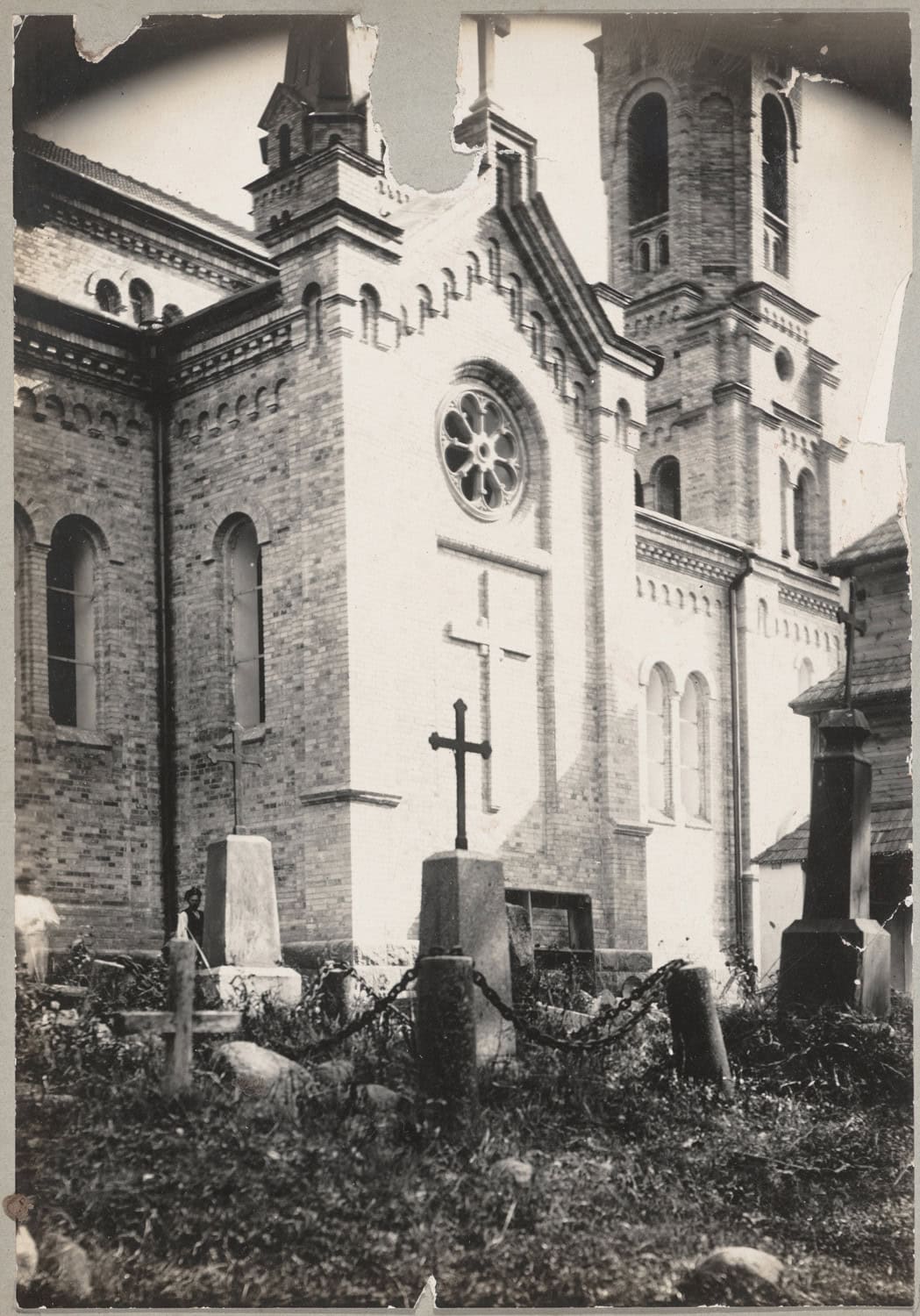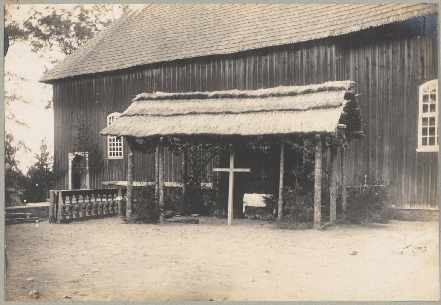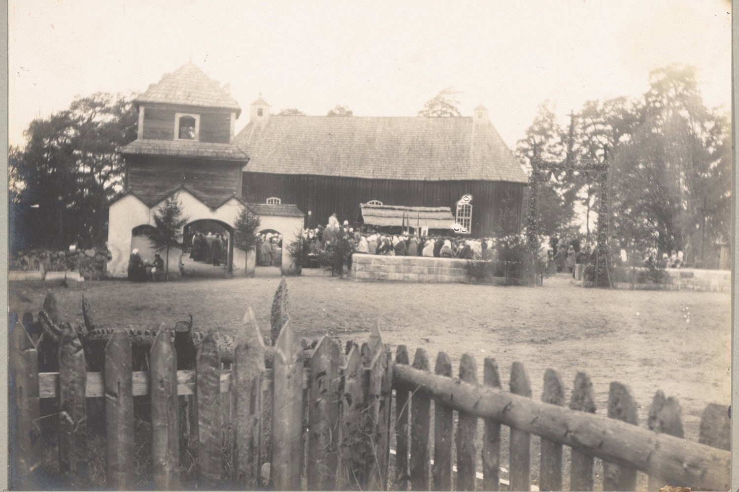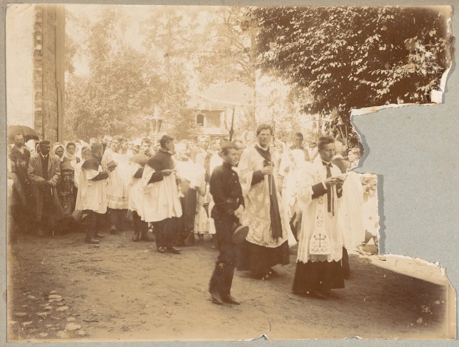 В краковском альбоме есть одна любопытная фотография, датированная 1907 годом — вероятно, ошибочно. На ней крестное шествие местных прихожан проходит через ворота с колокольней; слева виден старый деревянный костёл. С этого ракурса в 1907-м уже должен был просматриваться почти возведённый новый храм — но его нет. Сама процессия вокруг старого костёла косвенно подтверждает, что он ещё действовал: до 1903–1905 годов в Российской империи католические шествия разрешались лишь вокруг костёлов и в пределах костёльной ограды. Следовательно, снимок, скорее всего, 1900–1903 годов.