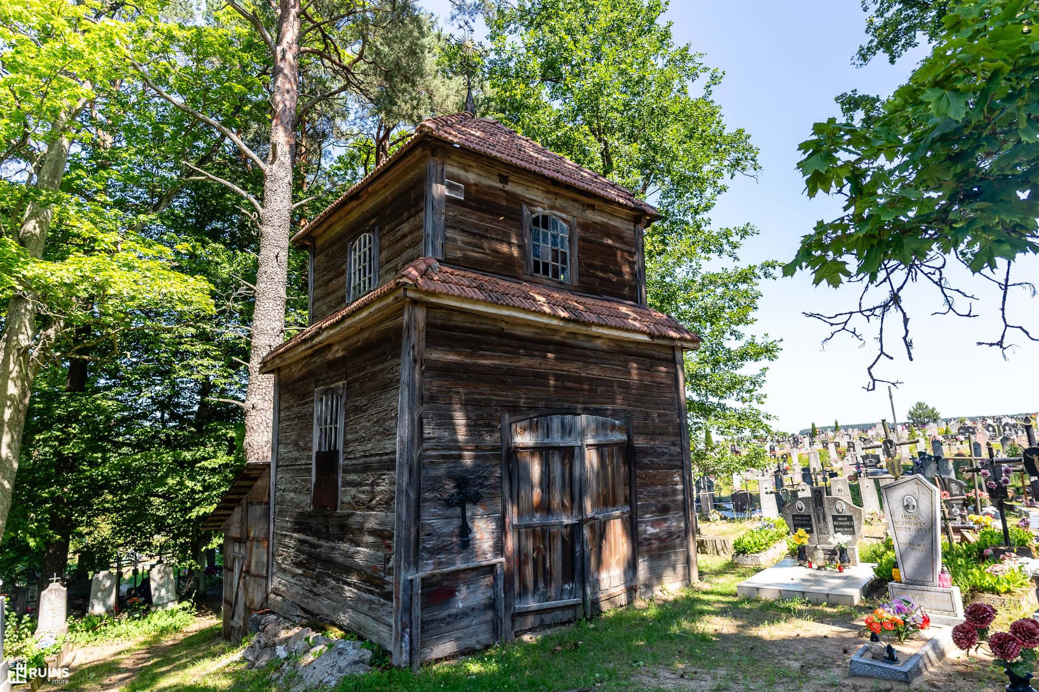 А ещё — я вас полюбил❤️, я вам расскажу! Старая звонница — как суслик: вы её не видите, а она есть. И если старый храм канул в лету, а каменные ворота разобрали, то звонницу середины XIX века всё же сохранили — её аккуратно «отлепили» от входной группы и перенесли вглубь кладбища правее нового храма, где она стоит и по сей день. Это небольшое, но гармоничное сооружение представляет собой двухъярусную четвериковую башню, изначально крытую гонтом, а теперь — черепицей. Довольно типичный для Беларуси тип колокольни с чертами барокко.